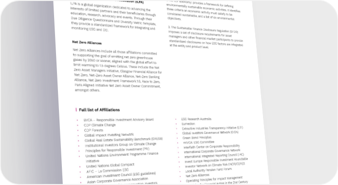 Preqin ESG Solutions 71 Sustainable Development Goals (SDGs) EU Sustainable Finance Action Plan The SDGs are a set of 17 global goals, established by the The EU Sustainable Finance Action Plan is the European UN General Assembly in 2015. The goals address key global Union’s strategy for sustainable 昀椀nance. It aims to reorient challenges, covering issues such as poverty, inequality, capital 昀氀ows towards sustainable 昀椀nance, manage 昀椀nancial climate change, environmental degradation, peace and risk stemming from ESG issues, and facilitate more justice. They are often referred to in the context of impact transparency and long-termism in 昀椀nancial activities. The investing, as a framework for de昀椀ning and assessing impact. Plan consists of several components, including: 1. The EU Taxonomy: provides a framework for de昀椀ning Institutional Limited Partners Association (ILPA) environmentally sustainable economic activities. It identi昀椀es ILPA is a global organization dedicated to advancing the three criteria an economic activity must satisfy to be interests of limited partners and their bene昀椀ciaries through considered sustainable, and a list of six environmental education, research, advocacy and events. Through their objectives. Due Diligence Questionnaire and Diversity Metric Template, 2. The Sustainable Finance Disclosure Regulation (SFDR): they provide a standardized framework for integrating and imposes a set of disclosure requirements for asset monitoring ESG and DEI. managers and other 昀椀nancial market participants to provide standardized disclosures on how ESG factors are integrated Net Zero Alliances at the entity and product level. Net Zero Alliances include all those a昀케liations committed to supporting the goal of emitting net zero greenhouse gases by 2050 or sooner, aligned with the global e昀昀ort to limit warming to 1.5 degrees Celsius. These include the Net Zero Asset Managers Initiative, Glasgow Financial Alliance for Net Zero, Net-Zero Asset Owner Alliance, Net-Zero Banking Alliance, Net Zero Investment Framework 1.0, Race to Zero, Paris Aligned Initiative Net Zero Asset Owner Commitment, amongst others. Full list of A昀케liations • BVCA – Responsible Investment Advisory Board • ESG Research Australia • CDP Climate Change • Eumedion • CDP Forests • Extractive Industries Transparency Initiative (EITI) • Global Impact Investing Network • Global Investors Governance Network (GIGN) • Global Real Estate Sustainability Benchmark (GRESB) • Green Bond Principles • Institutional Investors Group on Climate Change • HKVCA: ESG Committee • Principles for Responsible Investment (PRI) • Interfaith Center on Corporate Responsibility • United Nations Environment Programme Finance • International Corporate Governance Network Initiative • International Integrated Reporting Council (IIRC) • United Nations Global Compact • Invest Europe Responsible Investment Roundtable • AFIC – La Commission ESG • Investor Network on Climate Risk (INCR)/CERES • American Investment Council (ESG guidelines) • Local Authority Pension Fund Forum • Asian Corporate Governance Association • Net Zero Alliances • Australian Council of Superannuation Investors • Operating Principles for Impact Management • AVCA: Sustainability Committee • Principles for Financial Action in the 21st Century • CDP Water • Principles for Sustainable Insurance • Ceres • Regional or National Social Investment Forums (e.g. • CFA Institute Centre for Financial Market Integrity UKSIF, Eurosif, ASRIA, RIAA), specify • Climate Action 100+ • Responsible Finance Principles in Inclusive Finance • Code for Responsible Finance in the 21st Century • Shareholder Association for Research and Education • Code for Responsible Investment in SA (CRISA) (Share) • Council of Institutional Investors ↗ Back to Contents