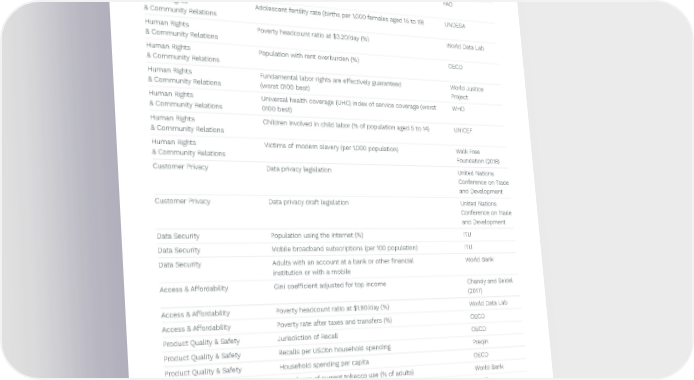 Preqin ESG Solutions 80 SASB Factor Indicator Source _____________________________________________________________________________________________________________________________________________________________________________________________________________________________________________________________________________________________________________________________________________________________________________________________________________________________________________ Ecological Impacts Red List Index of species survival (worst 0100 best) IUCN and Birdlife International Ecological Impacts Ocean Health Index: Clean Waters score (worst 0100 best) Ocean Health Index Ecological Impacts Permanent deforestation (% of forest area, 5 year average) Curtis et al. (2018) Ecological Impacts ECS Ecosystem services (tree, grass, wetland loss) EPI Human Rights Prevalence of undernourishment (%) FAO & Community Relations Human Rights Adolescent fertility rate (births per 1,000 females aged 15 to 19) UNDESA & Community Relations Human Rights Poverty headcount ratio at $3.20/day (%) World Data Lab & Community Relations Human Rights Population with rent overburden (%) OECD & Community Relations Human Rights Fundamental labor rights are e昀昀ectively guaranteed World Justice & Community Relations (worst 0100 best) Project Human Rights Universal health coverage (UHC) index of service coverage (worst WHO & Community Relations 0100 best) Human Rights Children involved in child labor (% of population aged 5 to 14) UNICEF & Community Relations Human Rights Victims of modern slavery (per 1,000 population) Walk Free & Community Relations Foundation (2018) Customer Privacy Data privacy legislation United Nations Conference on Trade and Development Customer Privacy Data privacy draft legislation United Nations Conference on Trade and Development Data Security Population using the internet (%) ITU Data Security Mobile broadband subscriptions (per 100 population) ITU Data Security Adults with an account at a bank or other 昀椀nancial World Bank institution or with a mobile Access & A昀昀ordability Gini coe昀케cient adjusted for top income Chandy and Seidel (2017) Access & A昀昀ordability Poverty headcount ratio at $1.90/day (%) World Data Lab Access & A昀昀ordability Poverty rate after taxes and transfers (%) OECD Product Quality & Safety Jurisdiction of Recall OECD Product Quality & Safety Recalls per USDbn household spending Preqin Product Quality & Safety Household spending per capita OECD Customer Welfare Prevalence of current tobacco use (% of adults) World Bank Customer Welfare Total per capital (15+) consumption (in litres of pure alcohol) by WHO country Customer Welfare Prevalence of obesity, BMI ≥ 30 (% of adult population) WHO Customer Welfare Subjective well-being (average ladder score, worst 010 best) Gallup Selling Practices & Product Household spending per capita OECD Labeling ↗ Back to Contents
