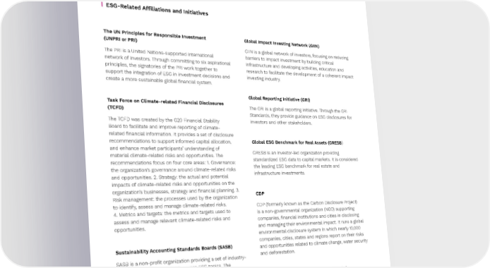 Preqin ESG Solutions 70 Appendix B ESG-Related A昀케liations and Initiatives The UN Principles for Responsible Investment Global Impact Investing Network (GIIN) (UNPRI or PRI) GIIN is a global network of investors, focusing on reducing The PRI is a United Nations-supported international barriers to impact investment by building critical network of investors. Through committing to six aspirational infrastructure and developing activities, education and principles, the signatories of the PRI work together to research to facilitate the development of a coherent impact support the integration of ESG in investment decisions and investing industry. create a more sustainable global 昀椀nancial system. Global Reporting Initiative (GRI) Task Force on Climate-related Financial Disclosures The GRI is a global reporting initiative. Through the GRI (TCFD) Standards, they provide guidance on ESG disclosures for The TCFD was created by the G20 Financial Stability investors and other stakeholders. Board to facilitate and improve reporting of climate- related 昀椀nancial information. It provides a set of disclosure recommendations to support informed capital allocation, Global ESG Benchmark for Real Assets (GRESB) and enhance market participants’ understanding of GRESB is an investor-led organization providing material climate-related risks and opportunities. The standardized ESG data to capital markets. It is considered recommendations focus on four core areas: 1. Governance: the leading ESG benchmark for real estate and the organization’s governance around climate-related risks infrastructure investments. and opportunities. 2. Strategy: the actual and potential impacts of climate-related risks and opportunities on the organization’s businesses, strategy and 昀椀nancial planning. 3. CDP Risk management: the processes used by the organization to identify, assess and manage climate-related risks. CDP (formerly known as the Carbon Disclosure Project) 4. Metrics and targets: the metrics and targets used to is a non-governmental organization (NGO) supporting assess and manage relevant climate-related risks and companies, 昀椀nancial institutions and cities in disclosing opportunities. and managing their environmental impact. It runs a global environmental disclosure system in which nearly 10,000 companies, cities, states and regions report on their risks Sustainability Accounting Standards Boards (SASB) and opportunities related to climate change, water security SASB is a non-pro昀椀t organization providing a set of industry- and deforestation. speci昀椀c disclosure standards across ESG topics. The standards are available across 77 industries, and identify Climate Disclosure Standards Board (CDSB) the most relevant ESG issues to 昀椀nancial performance in each industry. Alongside the SASB Materiality Map, these The CDSB is an international consortium of businesses standards help investors determine which ESG issues are and environmental non-governmental organizations (NGOs) material for reporting as well as helping facilitate more committed to advancing and aligning the global mainstream standardized benchmarking. corporate reporting model to equate natural capital with 昀椀nancial capital. ↗ Back to Contents