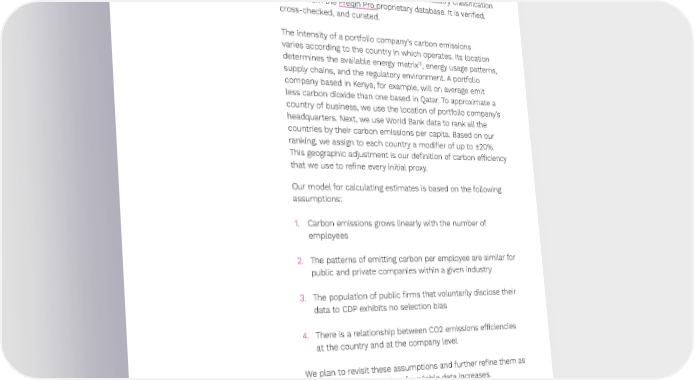 Preqin ESG Solutions 41 The intensity of carbon emissions per employee depends on the industry. In general, manufacturing Glass will generate more carbon dioxide per employee than Corporate Event Management. Therefore, for each industry we obtain a di昀昀erent proportion. This enables us to compute an estimate of carbon emissions for each company active in a given industry based on the number of its employees. The data on industry classi昀椀cation comes from the Preqin Pro proprietary database. It is veri昀椀ed, cross-checked, and curated. The intensity of a portfolio company's carbon emissions varies according to the country in which operates. Its location 10 determines the available energy matrix , energy usage patterns, supply chains, and the regulatory environment. A portfolio company based in Kenya, for example, will on average emit less carbon dioxide than one based in Qatar. To approximate a country of business, we use the location of portfolio company’s headquarters. Next, we use World Bank data to rank all the countries by their carbon emissions per capita. Based on our ranking, we assign to each country a modi昀椀er of up to ±20%. This geographic adjustment is our de昀椀nition of carbon e昀케ciency that we use to re昀椀ne every initial proxy. Our model for calculating estimates is based on the following assumptions: 1. Carbon emissions grows linearly with the number of employees 2. The patterns of emitting carbon per employee are similar for public and private companies within a given industry 3. The population of public 昀椀rms that voluntarily disclose their data to CDP exhibits no selection bias 4. There is a relationship between CO2 emissions e昀케ciencies at the country and at the company level We plan to revisit these assumptions and further re昀椀ne them as the scope and granularity of available data increases. 8 TCFD provides a leading standard for the classi昀椀cation of climate-related risks, used throughout the 昀椀nancial industry. 9 Due to low data coverage, it is not possible to use Market Capitalization as an alternative proxy. 10 The combination of fossil fuels, nuclear power, and renewable sources of energy used to satisfy domestic and industrial energy needs in a geographic region. ↗ Back to Contents
