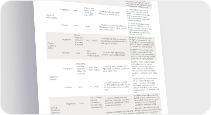 Preqin ESG Solutions 75 SASB ISSUE Score Type Subscores Raw Data Reading the Score Understanding the Risk Sources Data intense industries operating ITU; World …countries with high populations in countries with high online Geographic None Bank; with internet access and mobile populations are at greater risk of banking. data breaches and regulatory costs Data Security associated with data protection. Data intense industries operating Verizon; in countries with high online Industry None Ponemon …data intense industries. populations are at greater risk of Institute; data breaches and regulatory costs associated with data protection. Industries o昀昀ering basic needs Chandy and in countries with high rates of Geographic None Seidel (2017); …countries with high income income inequality or poverty face World Data inequality or poverty rates. market access risk and brand Lab; OECD; risk correlating with pricing and Access & business practices. A昀昀ordability Industries o昀昀ering basic needs …industries identi昀椀ed by SASB and in countries with high rates of Industry None SASB; ESG practitioners as facing material income inequality or poverty face a昀昀ordability risks. market access risk and brand risk correlating with pricing and business practices. Recall Industries where warranty costs subscore; …countries with high discretionary are high in countries with high Geographic Consumer OECD; Preqin; spending per capita in jurisdictions recall rates or consumer spending Product spending with high recall rates. are more likely to see higher costs Quality & subscore; in the event of a product failure. Safety Industries where warranty costs Kale, …industries with high warranty are high in countries with high Industry None Meneghetti, costs as a percentage of sales. recall rates or consumer spending Shahrur (2010); are more likely to see higher costs in the event of a product failure. Industries where consumer safety Preexisting risk is a byproduct of product condition World Bank; …countries with a populations of usage in countries with existing Geographic subscore; WHO; Gallup; high health risk factors and limited health risks and limited safety Safety net social safety nets. nets are more likely to see higher subscore; regulatory costs and market access Customer loss. Welfare Industries where consumer safety …industries identi昀椀ed by SASB, risk is a byproduct of product the FTC, and ESG practitioners as usage in countries with existing Industry None FTC; SASB; facing material consumer safety health risks and limited safety risks. nets are more likely to see higher regulatory costs and market access loss. OECD; United …countries where consumer Industries with unfettered access Nations spending is high and consumer to high spending consumer cohorts Geographic None Conference protection legislation is neither are at a high risk of loss of product Selling on Trade and pending nor passed. market access in the event of Practices Development; widespread fraudulent selling. & Product Industries with unfettered access Labeling …industries identi昀椀ed by SASB and to high spending consumer cohorts Industry None SASB; ESG practitioners as facing material are at a high risk of loss of product misselling risk. market access in the event of widespread fraudulent selling. ↗ Back to Contents