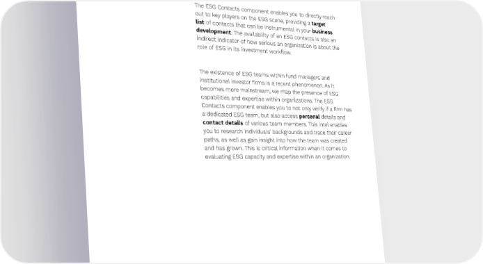 Preqin ESG Solutions 23 ESG Contacts The ESG Contacts component enables you to directly reach out to key players on the ESG scene, providing a target list of contacts that can be instrumental in your business development. The availability of an ESG contacts is also an indirect indicator of how serious an organization is about the role of ESG in its investment work昀氀ow. The existence of ESG teams within fund managers and institutional investor 昀椀rms is a recent phenomenon. As it becomes more mainstream, we map the presence of ESG capabilities and expertise within organizations. The ESG Contacts component enables you to not only verify if a 昀椀rm has a dedicated ESG team, but also access personal details and contact details of various team members. This intel enables you to research individuals’ backgrounds and trace their career paths, as well as gain insight into how the team was created and has grown. This is critical information when it comes to evaluating ESG capacity and expertise within an organization. ↗ Back to Contents