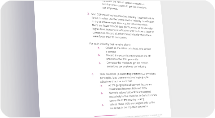 Preqin ESG Solutions 42 The process of generating carbon emissions metrics is outlined 11: below 1. For each company that reports emissions to CDP15: a. Obtain a volume of carbon emissions (Scope 1 and Scope 2) in metric tons b. Obtain employee count c. Calculate the ratio of carbon emissions to number of employees to get the emissions per employee. 2. Map CDP industries to a standard industry classi昀椀cation16 As far as possible, use the lowest level of Industry classi昀椀cation to try to achieve more accuracy. For industries where there are fewer than 20 data points, move up to a broader/ higher-level industry classi昀椀cation until we have at-least 20 companies. Discard all other industry levels where there were fewer than 20 companies. For each industry that remains after 2 a. Collect all the ratios calculated in 1c to form a sample b. Discard the potential outliers below the 5th and above the 95th percentile c. Compute the median to get the median emissions per employee per industry. 3. Rank countries (in ascending order) by CO2 emissions per capita. Map these emissions to geographic adjustment factors such that: a. All the geographic adjustment factors are constrained between 80% and 120% b. Numeric values below 90% are assigned exclusively to the countries in the bottom 5th percentile of the country ranking c. Values above 110% are assigned only to the countries in the top 95th percentile 11 The algorithm is similar for both Scope 1 and Scope 2 emissions estimation. For scope 2, we use the maximum of Market-based and Location-based emissions where both are reported to CDP. ↗ Back to Contents
