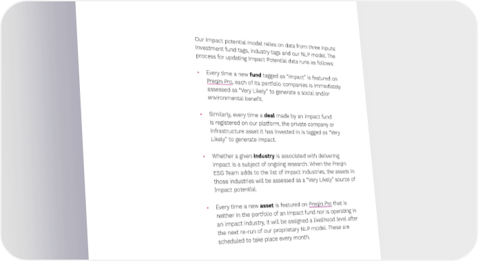 Preqin ESG Solutions 60 Data update process Our impact potential model relies on data from three inputs: investment fund tags, industry tags and our NLP model. The process for updating Impact Potential data runs as follows: • Every time a new fund tagged as “impact” is featured on Preqin Pro, each of its portfolio companies is immediately assessed as “Very Likely” to generate a social and/or environmental bene昀椀t. • Similarly, every time a deal made by an impact fund is registered on our platform, the private company or infrastructure asset it has invested in is tagged as “Very Likely” to generate impact. • Whether a given industry is associated with delivering impact is a subject of ongoing research. When the Preqin ESG Team adds to the list of impact industries, the assets in those industries will be assessed as a “Very Likely” source of impact potential. • Every time a new asset is featured on Preqin Pro that is neither in the portfolio of an impact fund nor is operating in an impact industry, it will be assigned a likelihood level after the next re-run of our proprietary NLP model. These are scheduled to take place every month. ↗ Back to Contents