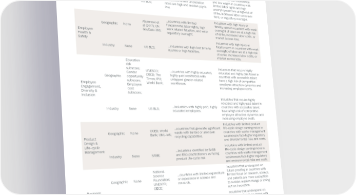 Preqin ESG Solutions 76 SASB ISSUE Score Type Subscores Raw Data Reading the Score Understanding the Risk Sources Industries with low unionization …countries where fundamental and low wages in countries with Geographic None ILO; OECD; labor rights are limited and limited labor rights and high unemployment is high. unemployment are at high risk of strike, increased labor costs over Labor time, or regulatory oversight. Practices Industries with low unionization …industries where unionization and low wages in countries with Industry None US BLS; rates are high and median pay is limited labor rights and high low. unemployment are at high risk of strike, increased labor costs over time, or regulatory oversight. …countries with limited Industries with high injury or Alsamawi et fundamental labor rights, high fatality rates in countries with weak Geographic None al (2017); UN work related fatalities, and weak oversight of labor are at a high risk Employee GovData 360; regulatory oversight. of strike, increased labor costs, or Health & market access loss. Safety Industries with high injury or …industries with high lost time to fatality rates in countries with weak Industry None US BLS; injuries or high fatalities. oversight of labor are at a high risk of strike, increased labor costs, or market access loss. Education risk Industries that require highly subscore; UNESCO; …countries with highly educated, educated and highly paid talent in Gender OECD; The highly paid workforces with countries with accessible talent Geographic opportunity Times; IPU; untapped gender-related have a high risk of competitive Employee subscore; World Bank; workforces. employee attraction dynamics and Engagement, Employee increasing employee costs. Diversity & cost Inclusion subscore; Industries that require highly educated and highly paid talent in Industry None US BLS; …industries with highly paid, highly countries with accessible talent educated employees. have a high risk of competitive employee attraction dynamics and increasing employee costs. Industries with limited product OCED; World …countries that generate signi昀椀cant life-cycle design contingencies in Geographic None Bank; UNU-IAS; waste with limited or unknown countries with waste management Product recycling capabilities. weaknesses face higher regulatory Design & and environmental risks and costs. Life-cycle Industries with limited product Management …industries identi昀椀ed by SASB life-cycle design contingencies in Industry None SASB; and ESG practicitioners as facing countries with waste management product life-cycle risk. weaknesses face higher regulatory and environmental risks and costs. National Industries that underspend on Science …countries with limited expenditure future proo昀椀ng in countries with Geographic None Foundation; or experience in science and limited focus on research, science, UNESCO; research. and patents are more susceptible Business OECD; to sudden market change or losing Model out on innovation. Resilience Industries that underspend on National future proo昀椀ng in countries with Industry None Science …industries that, on average, spend limited focus on research, science, Foundation; less on research and development. and patents are more susceptible to sudden market change or losing out on innovation. ↗ Back to Contents