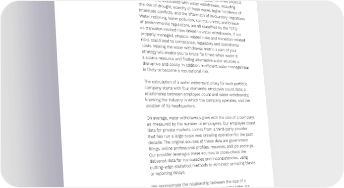 Preqin ESG Solutions 44 Water metrics An increase in global temperatures causes precipitation 12 changes , leading to erratic rainfall patterns and shifts in agricultural seasons. This can lead to droughts and tsunamis that decrease the amount of available freshwater. Simultaneously, water use has been increasing by about 1% per year since the 1980s. This makes water security a top priority for our adaptation to climate change. The TCFD identi昀椀es physical related risks, associated with water withdrawals, including the risk of drought, scarcity of fresh water, higher incidence of interstate con昀氀icts, and the aftermath of involuntary migrations. Water rationing, water pollution, societal unrest, and breach of environmental regulations are all classi昀椀ed by the TCFD as transition-related risks linked to water withdrawals. If not properly managed, physical related risks and transition-related risks could lead to compliance, regulatory and operational costs. Making the water withdrawal metric a part of your strategy will enable you to brace for times when water is a scarce resource and 昀椀nding alternative water sources is disruptive and costly. In addition, ine昀케cient water management is likely to become a reputational risk. The calculation of a water withdrawal proxy for each portfolio company starts with four elements: employee count data; a relationship between employee count and water withdrawals; knowing the industry in which the company operates; and the location of its headquarters. On average, water withdrawals grow with the size of a company, as measured by the number of employees. Our employee count data for private markets comes from a third-party provider that has run a large-scale web crawling operation for the past decade. The original sources of these data are government 昀椀lings, online professional pro昀椀les, resumes, and job postings. Our provider leverages these sources to cross-check the delivered data for inaccuracies and inconsistencies, using cutting-edge statistical methods to eliminate sampling biases or reporting delays. We approximate the relationship between the size of a company and water withdrawals, assuming the latter are proportional to the number of employees. Although this can be a conservative assumption in some cases, it works well for the majority of the sample. 12 De昀椀ned by the World Bank as the ratio of GDP to water withdrawals. ↗ Back to Contents