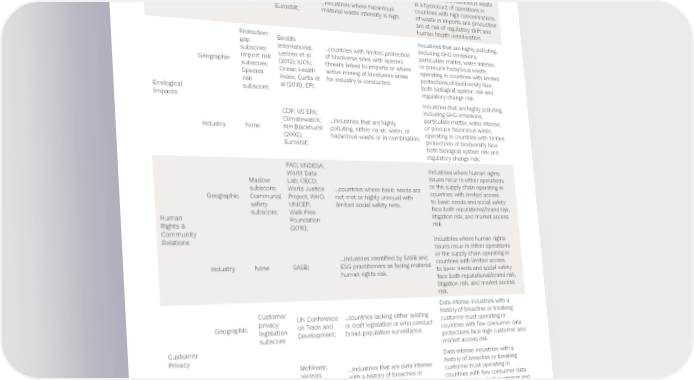 Preqin ESG Solutions 74 SASB ISSUE Score Type Subscores Raw Data Reading the Score Understanding the Risk Sources Industries where hazardous waste FAO; Lenzen et …countries with NOX, SOX, or is a byproduct of operations in Geographic None al (2020); Oita pesticide intense imports and countries with high concentrations et al (2016); production. of waste in imports and production Waste & are at risk of regulatory shift and Hazardous human health deterioration. Materials Industries where hazardous waste Management is a byproduct of operations in Industry None US EPA; …industries where hazardous countries with high concentrations Eurostat; material waste intensity is high. of waste in imports and production are at risk of regulatory shift and human health deterioration. Protection Birdlife Industries that are highly polluting, gap International; …countries with limited protection including GHG emissions, subscore; Lenzen et al of biodiverse sites with species particulate matter, water intense, Geographic Import risk (2012); IUCN; threats linked to imports or where or produce hazardous waste, subscore; Ocean Health active mining of biodiverse areas operating in countries with limited Species Index; Curtis et for industry is conducted. protections of biodiversity face risk al (2018); EPI; both biological system risk and Ecological subscore; regulatory change risk. Impacts Industries that are highly polluting, CDP; US EPA; including GHG emissions, Climatewatch; …industries that are highly particulate matter, water intense, Industry None NIH;Blackhurst polluting, either via air, water, or or produce hazardous waste, (2002); hazardous waste or in combination. operating in countries with limited Eurostat; protections of biodiversity face both biological system risk and regulatory change risk. FAO; UNDESA; Industries where human rights World Data issues recur in either operations Maslow Lab; OECD; or the supply chain operating in subscore; World Justice …countries where basic needs are countries with limited access Geographic Communal Project; WHO; not met or highly unequal with to basic needs and social safety safety UNICEF; limited social safety nets. face both reputational/brand risk, Human subscore; Walk Free litigation risk, and market access Rights & Foundation risk. Community (2018); Relations Industries where human rights issues recur in either operations …industries identi昀椀ed by SASB and or the supply chain operating in Industry None SASB; ESG practitioners as facing material countries with limited access human rights risk. to basic needs and social safety face both reputational/brand risk, litigation risk, and market access risk. Data intense industries with a Customer UN Conference …countries lacking either existing history of breaches or breaking Geographic privacy on Trade and or draft legislation or who conduct customer trust operating in legislation Development; broad population surveillance. countries with few consumer data subscore protections face high customer and Customer market access risk. Privacy Data intense industries with a McKinsey; …industries that are data intense history of breaches or breaking Industry None Verizon; with a history of breaches or customer trust operating in Ponemon limited consumer trust. countries with few consumer data Institute; protections face high customer and market access risk. ↗ Back to Contents