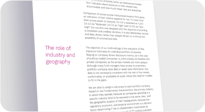 Preqin ESG Solutions 29 • Signi昀椀cant variations in scores within a portfolio point to blind spots in a 昀椀rm’s process and philosophy that could generate costs for stakeholders. • Variations in scores between portfolios re昀氀ect the composition and the origins of the underlying risk exposure. • Finally, variation of scores within an institutional investor 昀椀rm indicates where exposure to ESG-related risks accumulates and how much these risks are diversi昀椀ed. Comparison of scores across institutional investor 昀椀rms gives an indication of their relative appetite for risk. To make fund- level scores easier to interpret, 0.0-2.5 is assessed as “Low”, 2.5-5.0 as “Moderate”, 5.0-7.5 as “High”, and 7.5-10.0 as “Very High”. Our solution was designed with the objective of providing a consistent and credible narrative. It is also deliberately neutral and data-driven, rather than analyst-driven, to minimize the possibility of unconscious bias. The role of The objective of our methodology is the evaluation of Risk Exposure Estimates for individual portfolio companies. industry and Relying on company-driven disclosure metrics, as in the case of publicly traded companies, is unfortunately not feasible with geography private companies, as the private markets are more opaque. Although many fund managers have access to proprietary portfolio-company-level data or asset-level information, this data is not necessarily consistent with the rest of the market, conformable, or accessible at scale. Hence the need for models to 昀椀ll in the gaps. We are able to assign a risk proxy to each portfolio company based on two fundamental characteristics: the primary industry in which they operate, because all companies operating in a speci昀椀c industry tend to be exposed to the same risks; and the geographic location of their headquarters, because the regulatory, economic, and physical environment is a decisive factor determining if risk to stakeholders materializes as cost. Our framework draws on a set of 177 publicly available indicators to generate an ESG risk exposure score for each private company in the market. The formulation of our risk exposure model imposes limitations on how it can be used. Our methodology requires each corporate identity to be tagged with an industry. ↗ Back to Contents