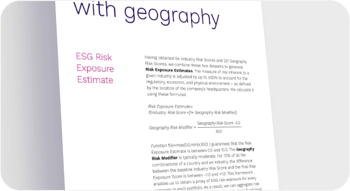 Preqin ESG Solutions 34 Modifying industry risk with geography ESG Risk Having obtained 54 Industry Risk Scores and 221 Geography Risk Scores, we combine these two datasets to generate Exposure Risk Exposure Estimates. The measure of risk inherent to a given industry is adjusted by up to ±50% to account for the Estimate regulatory, economic, and physical environment – as de昀椀ned by the location of the company’s headquarters. We calculate it using these formulas: Risk Exposure Estimate= f(Industry Risk Score ×[1+ Geography Risk Modi昀椀er]) Geography Risk Modi昀椀er = Geography Risk Score- 5.0 10.0 Function f(x)=max(0.0,min(x,10.0) ) guarantees that the Risk Exposure Estimate is between 0.0 and 10.0. The Geography Risk Modi昀椀er is typically moderate. For 70% of all the combinations of a country and an industry, the di昀昀erence between the baseline Industry Risk Score and the 昀椀nal Risk Exposure Score is between –1.0 and +1.0. This framework enables us to obtain a proxy of ESG risk exposure for every company in each portfolio. As a result, we can aggregate risk exposure scores associated with individual deals to fund level and fund manager 昀椀rm level. ↗ Back to Contents