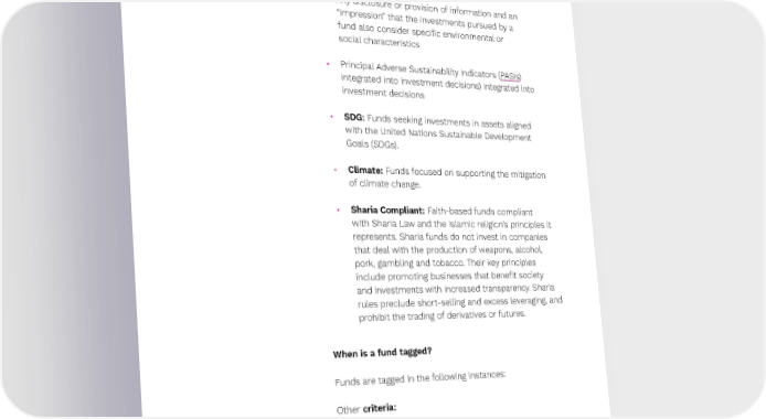 Preqin ESG Solutions 19 • SFDR Article 9: Funds whose objective, as de昀椀ned by the European Union's Sustainable Finance Disclosure Regulation (SFDR), is either sustainable investment or reducing carbon emissions. What quali昀椀es as sustainable investment: • Any disclosure or provision of information and an “impression” that the investments pursued by a fund also consider speci昀椀c environmental or social characteristics • Principal Adverse Sustainability Indicators (PASIs) integrated into investment decisions) integrated into investment decisions • SDG: Funds seeking investments in assets aligned with the United Nations Sustainable Development Goals (SDGs). • Climate: Funds focused on supporting the mitigation of climate change. • Sharia Compliant: Faith-based funds compliant with Sharia Law and the Islamic religion’s principles it represents. Sharia funds do not invest in companies that deal with the production of weapons, alcohol, pork, gambling and tobacco. Their key principles include promoting businesses that bene昀椀t society and investments with increased transparency. Sharia rules preclude short-selling and excess leveraging, and prohibit the trading of derivatives or futures. When is a fund tagged? Funds are tagged in the following instances: Other criteria: 1. The tag label (e.g., ‘Impact’) is included in the fund’s name. 2. Marketing materials or other collateral explicitly identify the fund with a tag label. 3. GPs self-declare their fund to be associated with a tag label. ↗ Back to Contents