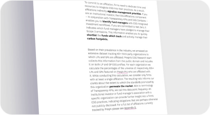 Preqin ESG Solutions 22 ESG A昀케liations To commit to an a昀케liation, 昀椀rms need to dedicate time and resources to integrate ESG into their practices. As a result, a昀케liations indirectly signalize management priorities. If you are an institutional investor, the ESG A昀케liations component – in conjunction with Transparency KPIs and ESG Contacts – enables you to identify fund managers with ESG-integrated investment work昀氀ows. If you are committed to Net Zero, it indicates which fund managers have pledged to manage their Scope 3 emissions. This information enables you to quickly shortlist the funds which track and actively manage their carbon footprints. Based on their prevalence in the industry, we amassed an extensive dataset tracking 40+ third-party organizations to which LPs and GPs are a昀케liated. Preqin’s ESG Research team collects this information from the public domain and includes it on both LP and GP ESG pro昀椀les. For each organization we calculate the percentages of the universe of, respectively, 60k+ LPs and GPs featured on Preqin Pro who are a昀케liated with it. While conducting this calculation, we consider only 昀椀rms with at least a single a昀케liation. The resulting ratio informs our clients about the extent to which the standards promoted by this organization permeate the market. Akin to terminology of Transparency KPIs, we call this data point frequency. An institutional investor or fund manager’s association with a speci昀椀c organization can provide further insight into a 昀椀rm’s ESG practices, indicating obligations that are perhaps otherwise not publicly disclosed. For a full list of a昀케liations currently tracked by Preqin please see Appendix B. ↗ Back to Contents