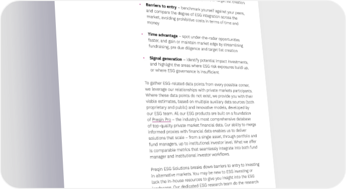 Preqin ESG Solutions 4 Preqin ESG We deliver standardized, comparable, and actionable ESG data that can easily be embedded into our clients’ investment Solutions work昀氀ows. Preqin ESG Solutions delivers value in four key value dimensions. • Search costs – cut the amount of resources, necessary to conduct fundraising, pre due diligence, or target list creation • Barriers to entry – benchmark yourself against your peers, and compare the degree of ESG integration across the market, avoiding prohibitive costs in terms of time and money • Time advantage – spot under-the-radar opportunities faster, and gain or maintain market edge by streamlining fundraising, pre due diligence and target list creation • Signal generation – identify potential impact investments, and highlight the areas where ESG risk exposures build up, or where ESG governance is insu昀케cient To gather ESG-related data points from every possible corner, we leverage our relationships with private markets participants. Where these data points do not exist, we provide you with their viable estimates, based on multiple auxiliary data sources (both proprietary and public) and innovative models, developed by our ESG team. All our ESG products are built on a foundation of Preqin Pro – the industry’s most comprehensive database of top-quality private market 昀椀nancial data. Our ability to merge informed proxies with 昀椀nancial data enables us to deliver solutions that scale – from a single asset, through portfolio and fund managers, up to institutional investor level. What we o昀昀er is comparable metrics that seamlessly integrate into both fund manager and institutional investor work昀氀ows. Preqin ESG Solutions breaks down barriers to entry to investing in alternative markets. You may be new to ESG investing or lack the in-house resources to give you insight into the ESG landscape. Our dedicated ESG research team do the research so you don’t have to. ↗ Back to Contents
