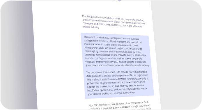 Preqin ESG Solutions 11 Module I: ESG Pro昀椀les Preqin’s ESG Pro昀椀les module enables you to quantify, visualize, and compare the key aspects of ESG management across fund managers and institutional investors active in the alternative assets industry. The extent to which ESG is integrated into the business management practices of fund managers and institutional investors varies in scope, depth, implementation, and transparency level. We wanted to give our clients a way to meaningfully compare ESG practices disclosed by 昀椀rms operating in the opaque private markets. Preqin’s ESG Pro昀椀les module, our 昀氀agship solution, enables clients to quantify, visualize, and compare key ESG-related aspects of corporate governance across di昀昀erent actors in alternative assets industry. The purpose of this module is to provide you with actionable data points that assess ESG integration within an organization. This makes it easier to create targeted fundraising campaigns, gather intel on your competitors, and benchmark yourself against the market. It can also help you pinpoint weak or insu昀케cient spots in ESG policies, identify funds that match your desired pro昀椀le, and improve stewardship. Our ESG Pro昀椀les module consists of six components. Each component gives our clients visibility of a single ESG-related aspect of a strategy, pursued either by a fund manager, or an institutional investor. The components cover: • SG policies and practices • Regulatory disclosures • Public commitments through notable third-party memberships ↗ Back to Contents