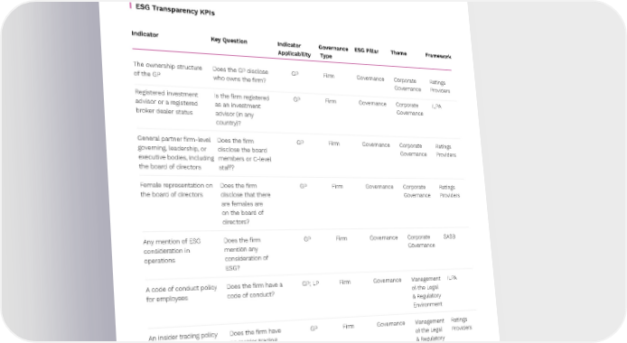 Preqin ESG Solutions 63 Appendix A ESG Transparency KPIs Indicator Key Question Indicator Governance ESG Pillar Theme Framework Applicability Type _____________________________________________________________________________________________________________________________________________________________________________________________________________________________________________________________________________________________________________________________________________________________________________________________________________________________________________ The ownership structure Does the GP disclose GP Firm Governance Corporate Ratings of the GP who owns the 昀椀rm? Governance Providers Registered investment Is the 昀椀rm registered GP Firm Governance Corporate ILPA advisor or a registered as an investment Governance broker dealer status advisor (in any country)? General partner 昀椀rm-level Does the 昀椀rm GP Firm Governance Corporate Ratings governing, leadership, or disclose the board Governance Providers executive bodies, including members or C-level the board of directors sta昀昀? Female representation on Does the 昀椀rm GP Firm Governance Corporate Ratings the board of directors disclose that there Governance Providers are females are on the board of directors? Any mention of ESG Does the 昀椀rm GP Firm Governance Corporate SASB consideration in mention any Governance operations consideration of ESG? A code of conduct policy Does the 昀椀rm have a GP; LP Firm Governance Management ILPA for employees code of conduct? of the Legal & Regulatory Environment An insider trading policy Does the 昀椀rm have GP Firm Governance Management Ratings an insider trading of the Legal Providers policy? & Regulatory Environment An anti-money laundering Does the 昀椀rm have GP Firm Governance Management Ratings and/or "know your client" an anti-money of the Legal Providers (AML KYC) policy laundering/know & Regulatory your client (AML KYC) Environment policy? ↗ Back to Contents