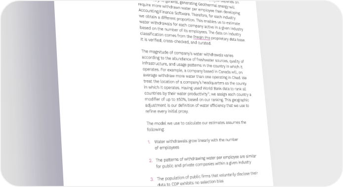 Preqin ESG Solutions 45 We assume that the proportion for private companies is the same as that extracted from public company data. Employee count and voluntarily disclosures of water withdrawal for public market companies are provided by Disclosure, Insight, Action (CDP). The intensity of water withdrawals per employee depends on the industry. In general, generating Geothermal energy will require more withdrawn water per employee than developing Accounting/Finance Software. Therefore, for each industry we obtain a di昀昀erent proportion. This enables us to estimate water withdrawals for each company active in a given industry based on the number of its employees. The data on industry classi昀椀cation comes from the Preqin Pro proprietary data base. It is veri昀椀ed, cross-checked, and curated. The magnitude of company’s water withdrawals varies according to the abundance of freshwater sources, quality of infrastructure, and usage patterns in the country in which it operates. For example, a company based in Canada will, on average withdraw more water than one operating in Chad. We treat the location of a company’s headquarters as the county in which it operates. Having used World Bank data to rank all 13 countries by their water productivity , we assign each country a modi昀椀er of up to ±50%, based on our ranking. This geographic adjustment is our de昀椀nition of water e昀케ciency that we use to re昀椀ne every initial proxy. The model we use to calculate our estimates assumes the following: 1. Water withdrawals grow linearly with the number of employees 2. The patterns of withdrawing water per employee are similar for public and private companies within a given industry 3. The population of public 昀椀rms that voluntarily disclose their data to CDP exhibits no selection bias 4. There is a relationship between water e昀케ciencies at the country and company levels We plan to revisit these assumptions and further re昀椀ne them as the scope and granularity of available data increases. ↗ Back to Contents