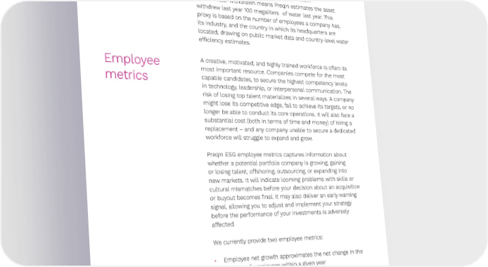 Preqin ESG Solutions 47 ii. The median water withdrawal per employee per industry as computed in 3c .based on the industry the company operates in. What do our water withdrawal estimates mean? 100 Ml water withdrawn means Preqin estimates the asset withdrew last year 100 megaliters of water last year. This proxy is based on the number of employees a company has, its industry, and the country in which its headquarters are located, drawing on public market data and country-level water e昀케ciency estimates. Employee A creative, motivated, and highly trained workforce is often its most important resource. Companies compete for the most metrics capable candidates, to secure the highest competency levels in technology, leadership, or interpersonal communication. The risk of losing top talent materializes in several ways. A company might lose its competitive edge, fail to achieve its targets, or no longer be able to conduct its core operations. It will also face a substantial cost (both in terms of time and money) of hiring a replacement – and any company unable to secure a dedicated workforce will struggle to expand and grow. Preqin ESG employee metrics captures information about whether a potential portfolio company is growing, gaining or losing talent, o昀昀shoring, outsourcing, or expanding into new markets. It will indicate looming problems with skills or cultural mismatches before your decision about an acquisition or buyout becomes 昀椀nal. It may also deliver an early warning signal, allowing you to adjust and implement your strategy before the performance of your investments is adversely a昀昀ected. We currently provide two employee metrics: • Employee net growth approximates the net change in the number of employees within a given year • Employee volatility estimates the gross change in the number of employees within a given year. It approximates employee turnover rates. Both metrics are relative to the size of a company, so values are comparable across an entire portfolio. ↗ Back to Contents