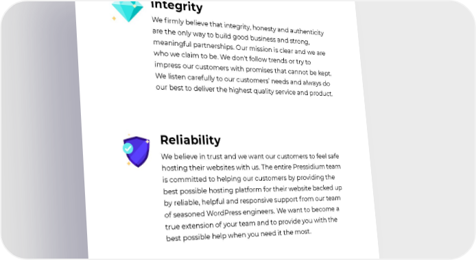 We believe in trust and we want our customers to feel safe hosting their websites with us. The entire Pressidium team is committed to helping our customers by providing the best possible hosting platform for their website backed up by reliable, helpful and responsive support from our team of seasoned WordPress engineers. We want to become a true extension of your team and to provide you with the best possible help when you need it the most. Reliability We firmly believe that integrity, honesty and authenticity are the only way to build good business and strong, meaningful partnerships. Our mission is clear and we are who we claim to be. We don't follow trends or try to impress our customers with promises that cannot be kept. We listen carefully to our customers’ needs and always do our best to deliver the highest quality service and product. 14 Integrity