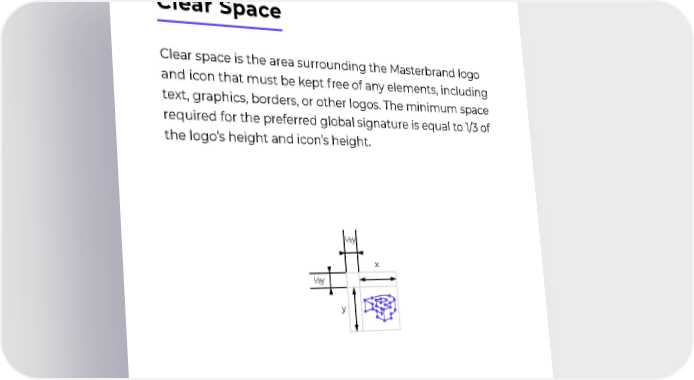Clear space is the area surrounding the Masterbrand logo and icon that must be kept free of any elements, including text, graphics, borders, or other logos. The minimum space required for the preferred global signature is equal to 1/3 of the logo’s height and icon’s height. Clear Space 16 26 ⅓ y ⅓ y x y