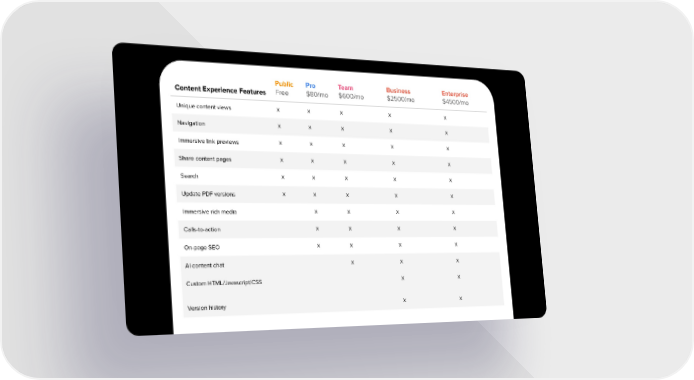 Content Experience Features Public Free Pro $80/mo Team $600/mo Business $2500/mo Enterprise $4500/mo Unique content views X X X X X Navigation X X X X X Immersive link previews X X X X X Share content pages X X X X X Search X X X X X Update PDF versions X X X X X Immersive rich media X X X X Calls-to-action X X X X On-page SEO X X X X AI content chat X X X Custom HTML/Javascript/CSS X X Version history X X