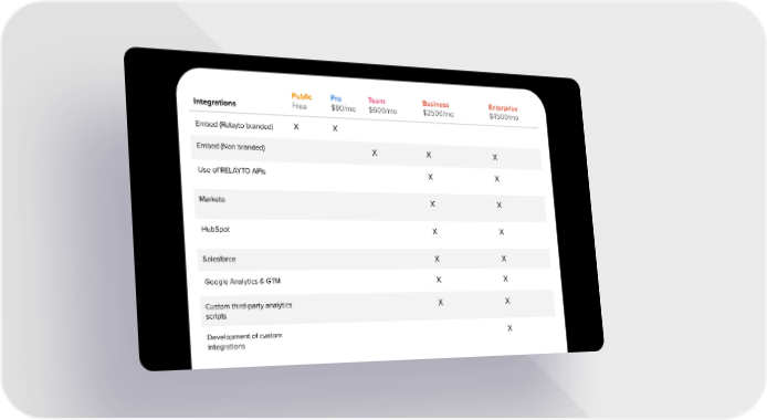 Integrations Public Free Pro $80/mo Team $600/mo Business $2500/mo Enterprise $4500/mo Embed (Relayto branded) X X Embed (Non branded) X X X Use of RELAYTO APIs X X Marketo X X HubSpot X X Salesforce X X Google Analytics & GTM X X Custom third-party analytics scripts X X Development of custom integrations X