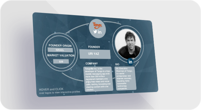 FOUNDER ORIGIN FOUNDER ISRAEL IRAQ URI YAZ MARKET VALUATION DAVID HINDAWI $5B $2B COMPANY BIO ove TangoMe Inc. is the Uri, Executive r developer of Tango is a free Chairman of Tango, mobile messaging app with is a serial log more than 350 million entrepreneur and os registered members who Internet visionary, to enjoy free video and voice founding many calls, texting, browsing and successful HOVER and CLICK sharing content with one technology over logos to view interactive profiles another. companies.