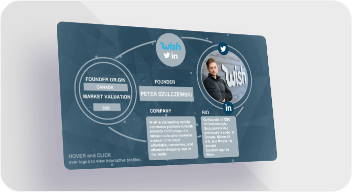 FOUNDER ORIGIN FOUNDER CANADA IRAQ PETER SZULCZEWSKI MARKET VALUATION DAVID HINDAWI $5B $9B COMPANY BIO ove Wish is the leading mobile Co-founder of CEO r commerce platform in North of ContextLogic, Szulczewski was log America and Europe. It’s previously a coder at mission is to give everyone os access to the most Google, Microsoft, to affordable, convenient, and ATI, and Nvidia. He effective shopping mall in pivoted HOVER and CLICK the world. ContextLogic to over logos to view interactive profiles Wish.