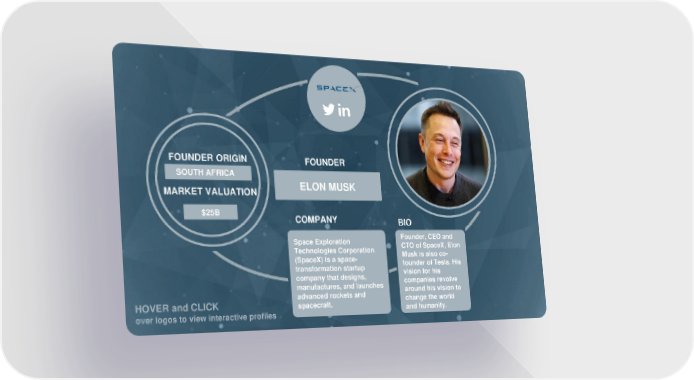 FOUNDER ORIGIN FOUNDER SOUTH AFRICA IRAQ ELON MUSK MARKET VALUATION DAVID HINDAWI $5B $25B COMPANY BIO ove Space Exploration Founder, CEO and r Technologies Corporation CTO of SpaceX, Elon Musk is also co- (SpaceX) is a space- log transformation startup founder of Tesla. His os company that designs, vision for his to manufactures, and launches companies revolve advanced rockets and around his vision to HOVER and CLICK spacecraft. change the world over logos to view interactive profiles and humanity.