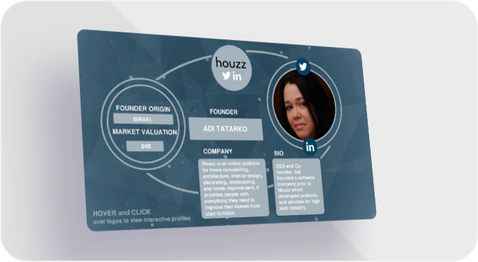 FOUNDER ORIGIN FOUNDER ISRAEL IRAQ DAVIADI D TATAHINDAWIRKO MARKET VALUATION $5B $4B COMPANY BIO Houzz is an online platform ove CEO and Co- for home remodelling, r architecture, interior design, founder, Adi log decorating, landscaping, founded a software company prior to and home improvement. It os Houzz which provides people with to everything they need to developed products HOVER and CLICK improve their homes from and services for high start to finish. tech industry. over logos to view interactive profiles