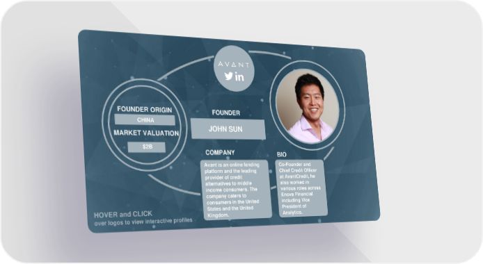 FOUNDER ORIGIN FOUNDER CHINA IRAQ JOHN SUN MARKET VALUATION DAVID HINDAWI $5B $2B COMPANY BIO ove Avant is an online lending Co-Founder and r platform and the leading Chief Credit Officer provider of credit at AvantCredit, he log alternatives to middle also worked in os income consumers. The various roles across to company caters to Enova Financial consumers in the United including Vice HOVER and CLICK States and the United President of over logos to view interactive profiles Kingdom. Analytics.