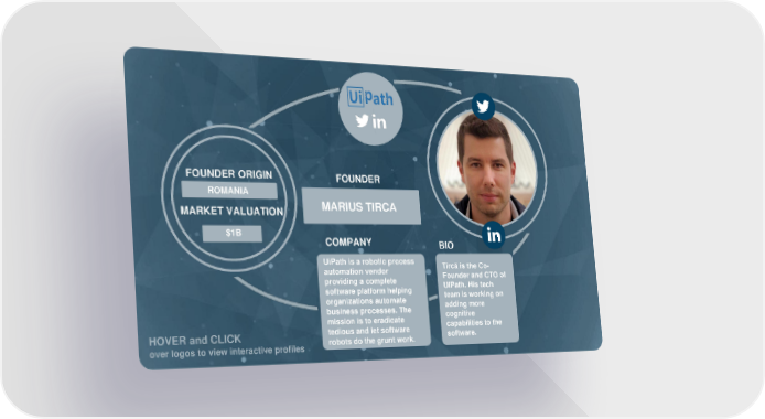 FOUNDER ORIGIN FOUNDER ROMANIA IRAQ DAVID HINDAWI MARKET VALUATION MARIUS TIRCA $5B $1B COMPANY BIO UiPath is a robotic process ove Tîrcă is the Co- automation vendor r providing a complete Founder and CTO of log software platform helping UiPath. His tech team is working on organizations automate os adding more business processes. The to mission is to eradicate cognitive HOVER and CLICK tedious and let software capabilities to the robots do the grunt work. software. over logos to view interactive profiles