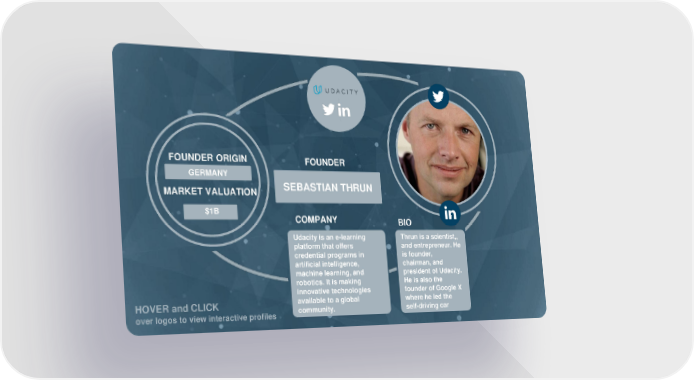 FOUNDER ORIGIN FOUNDER GERMANY IRAQ DAVID HINDAWI MARKET VALUATION SEBASTIAN THRUN $5B $1B COMPANY BIO ove Udacity is an e-learning Thrun is a scientist,, r platform that offers and entrepreneur. He credential programs in is founder, log artificial intelligence, chairman, and os machine learning, and president of Udacity. to robotics. It is making He is also the innovative technologies founder of Google X HOVER and CLICK available to a global where he led the over logos to view interactive profiles community. self-driving car