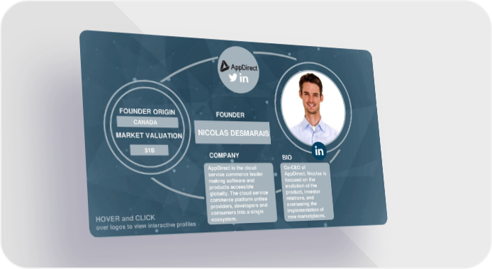 FOUNDER ORIGIN FOUNDER CANADA IRAQ DAVID HINDAWI MARKET VALUATION NICOLAS DESMARAIS $5B $1B COMPANY BIO ove AppDirect is the cloud Co-CEO of r service commerce leader AppDirect, Nicolas is making software and focused on the log products accessible evolution of the os globally. The cloud service product, investor to commerce platform unites relations, and providers, developers and overseeing the HOVER and CLICK consumers into a single implementation of over logos to view interactive profiles ecosystem. new marketplaces.