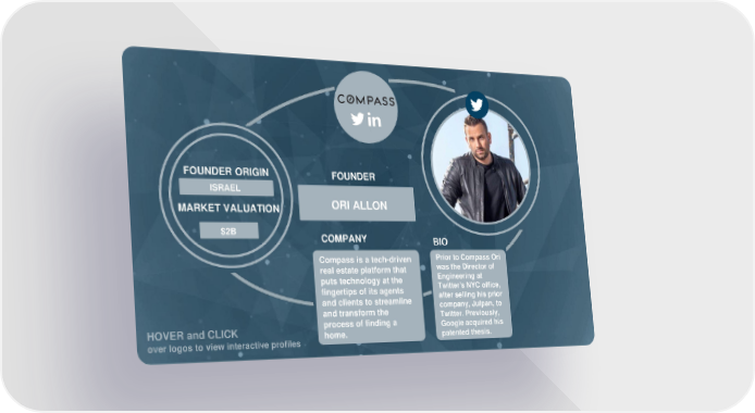 FOUNDER ORIGIN FOUNDER ISRAEL IRAQ DAVID HINDAWI MARKET VALUATION ORI ALLON $5B $2B COMPANY BIO ove Compass is a tech-driven Prior to Compass Ori r real estate platform that was the Director of Engineering at puts technology at the log fingertips of its agents Twitter's NYC office, os and clients to streamline after selling his prior to and transform the company, Julpan, to process of finding a Twitter. Previously, HOVER and CLICK home. Google acquired his over logos to view interactive profiles patented thesis.
