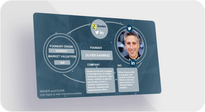FOUNDER ORIGIN FOUNDER GERMANY IRAQ DAVID HINDAWI MARKET VALUATION OLIVER KHARRAZ $5B $2B COMPANY BIO Zocdoc is the tech company ove r at the beginning of a better Oliver Kharraz, MD, is president and healthcare experience. Each log month, millions of patients founder of ZocDoc. os use Zocdoc to find in- Oliver is the most to network neighborhood recent doctor in a doctors, instantly book 300-year family HOVER and CLICK appointments online, tradition. over logos to view interactive profiles