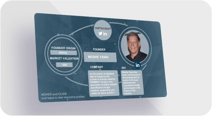 FOUNDER ORIGIN FOUNDER ISRAEL IRAQ MOSHE DAVID HINDAWIYANAI MARKET VALUATION $5B $2B COMPANY BIO ove As the growth of digitized Moshe Yanai has r data is outpacing the been instrumental in the development of growth of storage capacity, log INFINIDAT brings a new some of the most os generation of highly reliable advanced and to and efficient storage successful storage systems, supporting your technologies in the HOVER and CLICK needs for future growth. I history of the over logos to view interactive profiles industry.