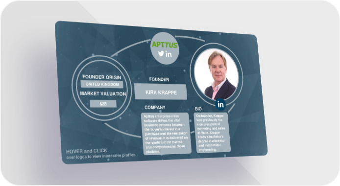 FOUNDER ORIGIN FOUNDER UNITED KINGDOM IRAQ DAVID HINDAWI MARKET VALUATION KIRK KRAPPE $5B $2B COMPANY BIO ove Apttus enterprise-class Co-founder, Krappe r software drives the vital was previously the business process between vice president of log the buyer’s interest in a marketing and sales os purchase and the realization at Verix. Krappe to of revenue. It is delivered on holds a bachelor’s the world’s most trusted degree in electrical HOVER and CLICK and comprehensive cloud and mechanical over logos to view interactive profiles platform. engineering.