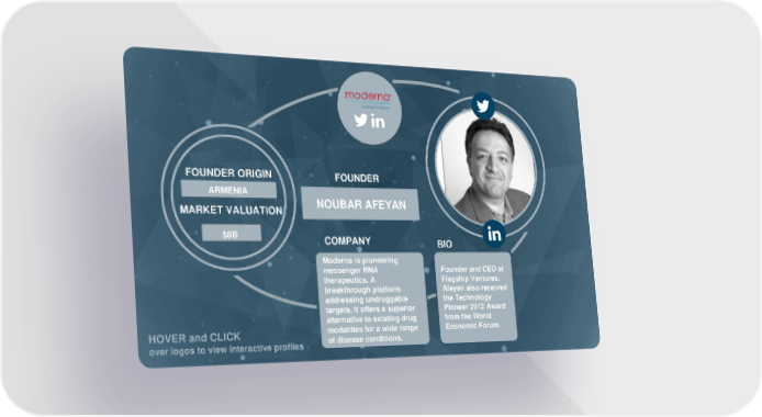 FOUNDER ORIGIN FOUNDER ARMENIA IRAQ NOUBAR AFEYAN MARKET VALUATION DAVID HINDAWI $5B $8B COMPANY BIO Moderna is pioneering ove r messenger RNA Founder and CEO at therapeutics. A Flagship Ventures, log breakthrough platform Afeyan also received os addressing undruggable the Technology to targets, it offers a superior Pioneer 2012 Award alternative to existing drug from the World HOVER and CLICK modalities for a wide range Economic Forum. over logos to view interactive profiles of disease conditions.