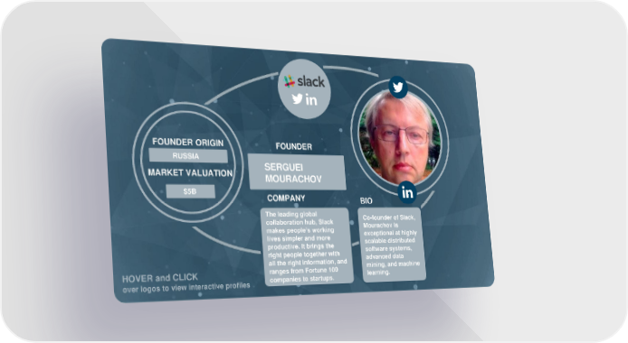 FOUNDER ORIGIN FOUNDER RUSSIA IRAQ SERGUEI MARKET VALUATION DAVID HINDAWI MOURACHOV $5B $5B COMPANY BIO The leading global ove Co-founder of Slack, collaboration hub, Slack r Mourachov is makes people’s working log lives simpler and more exceptional at highly scalable distributed productive. It brings the os software systems, right people together with to all the right information, and advanced data HOVER and CLICK ranges from Fortune 100 mining, and machine companies to startups. learning. over logos to view interactive profiles