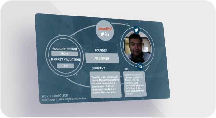 FOUNDER ORIGIN FOUNDER INDIA IRAQ DAVID HINDAWI MARKET VALUATION LAKS SRINI $5B $2B COMPANY BIO ove Laks Srini is the co- Zenefits is the leading all- r founder and CTO of in-one Digital HR platform log Zenefit. Prior to for small and medium Zenefits, Laks os businesses. It delivers served at SigFig and to the most complete, all- D. E. Shaw & Co. HOVER and CLICK mobile HR experience. Laks graduated with a M.Sc. over logos to view interactive profiles