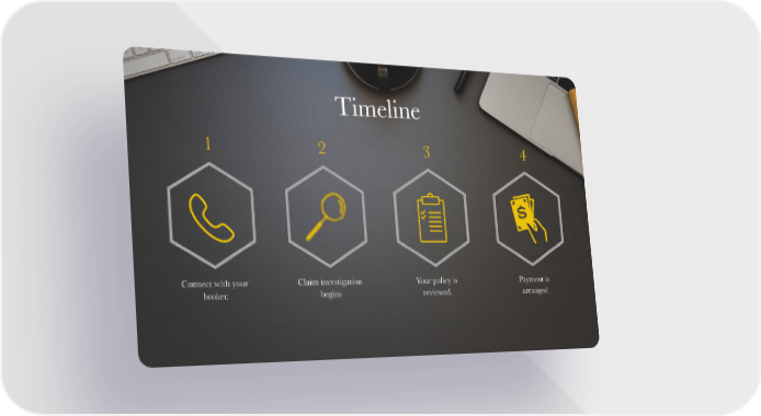 Timeline 1 2 3 4 Connect with your Claim investigation Your policy is Payment is broker. begins reviewed. arranged