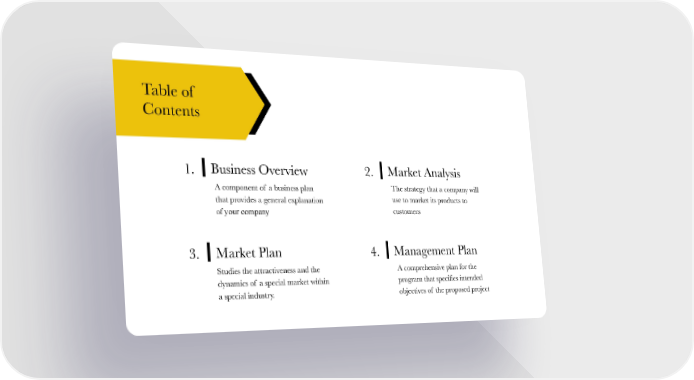 Table of Contents Market Analysis 1. Business Overview 2. A component of a business plan The strategy that a company will that provides a general explanation use to market its products to of your company customers 3. Market Plan 4. Management Plan Studies the attractiveness and the A comprehensive plan for the dynamics of a special market within program that specifies intended a special industry. objectives of the proposed project
