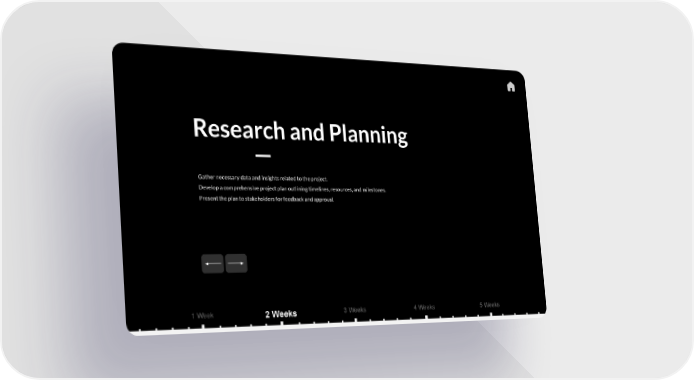 Research and Planning Gather necessary data and insights related to the project. Develop a comprehensive project plan outlining timelines, resources, and milestones. Present the plan to stakeholders for feedback and approval. 1 Week 3 Weeks 4 Weeks 5 Weeks 2 Weeks