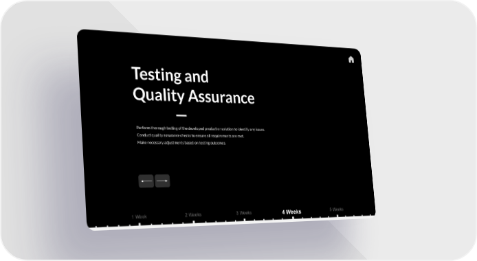 Testing and Quality Assurance Perform thorough testing of the developed product or solution to identify any issues. Conduct quality assurance checks to ensure all requirements are met. Make necessary adjustments based on testing outcomes. 1 Week 2 Weeks 3 Weeks 5 Weeks 4 Weeks