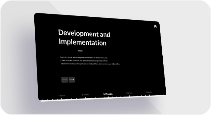 Development and Implementation Begin the design and development phase based on the approved plan. Conduct regular check-ins and updates to ensure progress is on track. Implement necessary changes based on feedback from team members and stakeholders. 1 Week 2 Weeks 4 Weeks 5 Weeks 3 Weeks