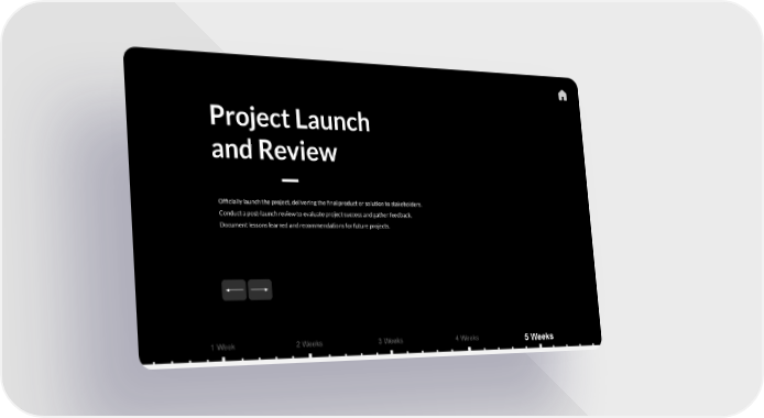 Project Launch and Review Officially launch the project, delivering the final product or solution to stakeholders. Conduct a post-launch review to evaluate project success and gather feedback. Document lessons learned and recommendations for future projects. 1 Week 2 Weeks 3 Weeks 4 Weeks 5 Weeks