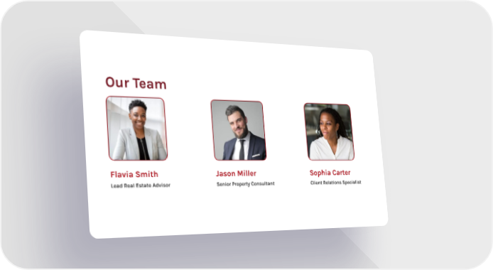 Our Team Jason Miller Senior Property Consultant Sophia Carter Client Relations Specialist Flavia Smith Lead Real Estate Advisor