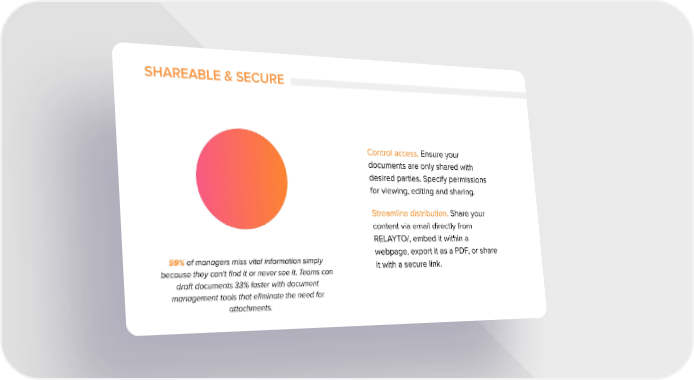 SHAREABLE & SECURE Control access. Ensure your documents are only shared with desired parties. Specify permissions for viewing, editing and sharing. Streamline distribution. Share your content via email directly from RELAYTO/, embed it within a webpage, export it as a PDF, or share 59% of managers miss vital information simply it with a secure link. because they can't find it or never see it. Teams can draft documents 33% faster with document management tools that eliminate the need for attachments.