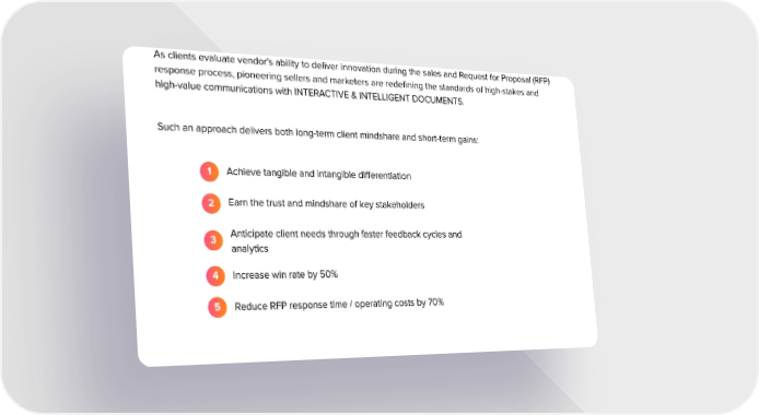 As clients evaluate vendor's ability to deliver innovation during the sales and Request for Proposal (RFP) response process, pioneering sellers and marketers are redeļ¬ning the standards of high-stakes and high-value communications with INTERACTIVE & INTELLIGENT DOCUMENTS. Such an approach delivers both long-term client mindshare and short-term gains: 1 Achieve tangible and intangible diļ¬erentiation Earn the trust and mindshare of key stakeholders 2 Anticipate client needs through faster feedback cycles and 3 analytics 4 Increase win rate by 50% 5 Reduce RFP response time / operating costs by 70%