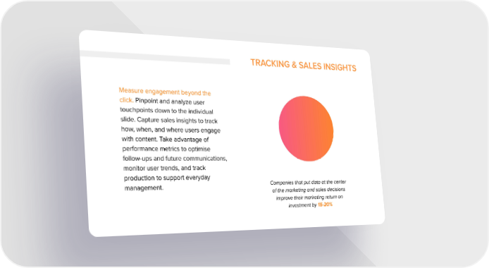 TRACKING & SALES INSIGHTS Measure engagement beyond the click. Pinpoint and analyze user touchpoints down to the individual slide. Capture sales insights to track how, when, and where users engage with content. Take advantage of performance metrics to optimise follow-ups and future communications, monitor user trends, and track production to support everyday Companies that put data at the center management. of the marketing and sales decisions improve their marketing return on investment by 15-20%