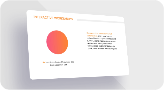 INTERACTIVE WORKSHOPS Capture robust feedback from all stakeholders. Share your interim deliverables in one place. Embed web surveys, voting mechanisms & virtual whiteboards alongside solution previews and recommendations for quick, more accurate feedback cycles. 5.4 people are involved in average B2B buying decision - CEB